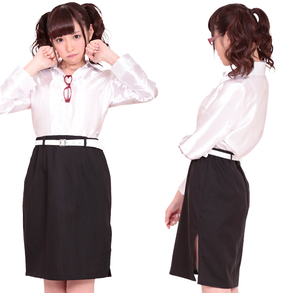 憧れの美人教師に変身!ブラックのスカートに入ったスリットから覗く生足が、セクシーなコスチューム。白ベルトがポイントマークになって脚長効果も。光沢感のあるシャツはフロントにフリルをあしらう事で、クールすぎない大人の魅力をアピール!
