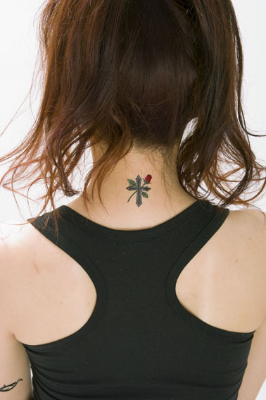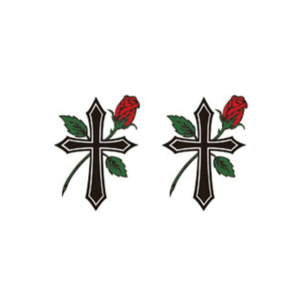 お洒落のワンポイントに!ミニサイズのペーパータトゥーシール「ローズ&クロス」。コスプレ等に合わせて露出した肌に貼り付けるだけ!特殊な素材を使用しているので皮膚の動きと一緒に伸び縮みし、入浴したり海やプールに入っても2〜3日は取れません。祭り化粧を取る際は、専用のクリーナーやクレンジングクリーム、ベビーローション等で拭き取って下さい。