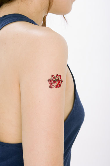 お洒落のワンポイントに!ミニサイズの刺青シール「蓮の花」。コスプレ等に合わせて露出した肌に貼り付けるだけ!特殊な素材を使用しているので皮膚の動きと一緒に伸び縮みし、入浴したり海やプールに入っても2〜3日は取れません。祭り化粧を取る際は、専用のクリーナーやクレンジングクリーム、ベビーローション等で拭き取って下さい。