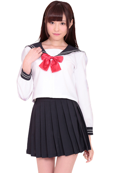 長袖ブラウスに定番の白×紺ラインがデザインされた、清楚感溢れるセーラー服コスチューム。少しミニ丈なプリーツスカートは、清楚だけどどこかセクシー!紺×白に赤いリボンがマッチし、王道だけど可愛らしいセーラー服に仕上がっています。