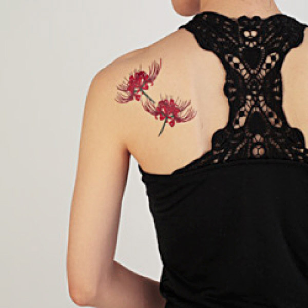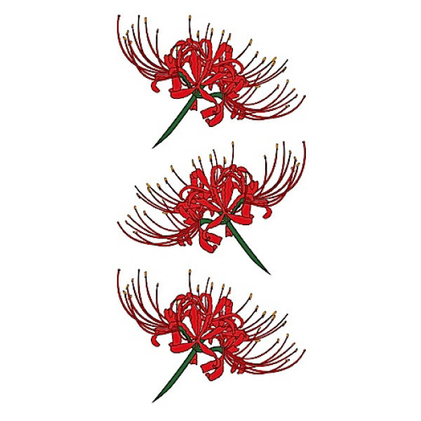 美しく咲き誇る曼珠沙華の花が色っぽい!リアルに仕上がるレギュラーサイズの本格派タトゥーシール。肌に馴染む特殊な素材を採用し、入浴しても剥がれずに2〜3日楽しめます。セクシーな露出系コスチュームとも相性バツグン!素肌を美しく飾るオシャレのワンポイント用に最適なボディーシールです。首や胸、手足などお好きな場所に貼り付けてお使い下さい。