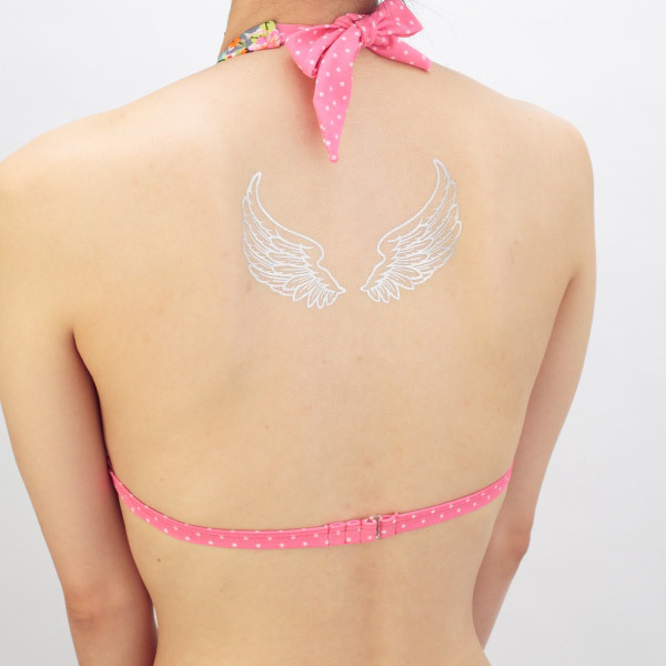 背中にシルバーの羽を持つ美しいエンジェルに!簡単貼り付けタイプのタトゥーシール「天使の羽・銀」。水を使って気軽に貼り付けられるので、パーティーやお祭り等のイベントにピッタリ!水に強く、入浴しても2〜3日は持続可能!セクシーなコスプレ衣装とも相性バツグンのボディシールです。剥がす際は市販のメイク落としや専用のリムーバーをご使用ください。