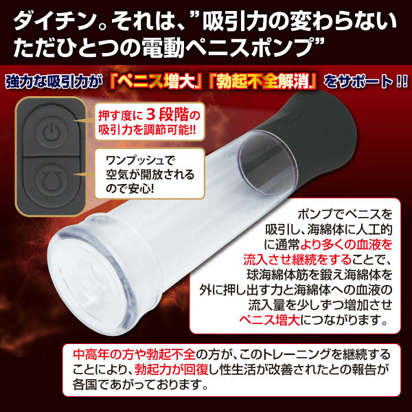 「ペニスを増大したい」「勃起不全を解消したい」といった男性のお悩みもこれで解決!お悩みを解決しながら快感も得られる、まさに一石二鳥の電動ペニス増大ポンプ「dytin ダイチン」です。