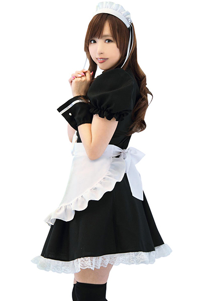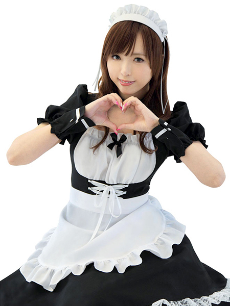 黒×白の王道カラー!充実セットのメイド服コスチューム。ワンピースはハイウエストのコルセットデザインでバストを強調!フリルエプロンにカチューシャ、チョーカーに加え、カフスも付属した豪華なメイドさん衣装です。