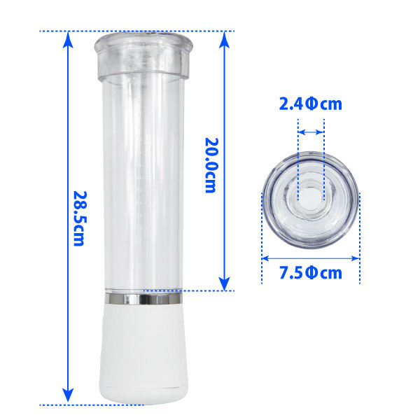 ボタンプッシュで自動的に吸引!球海綿本筋のトレーニング用、電動タイプのペニス増大ポンプ。日々継続して利用することで勃起力が改善されることも!シリンダーには目盛りが刻まれているので、ムスコの長さを確認できます。大ボタンは3段階の強弱調整、小ボタンは空気弁の開放用!片手操作ができるスタイリッシュなペニス増大ポンプです。