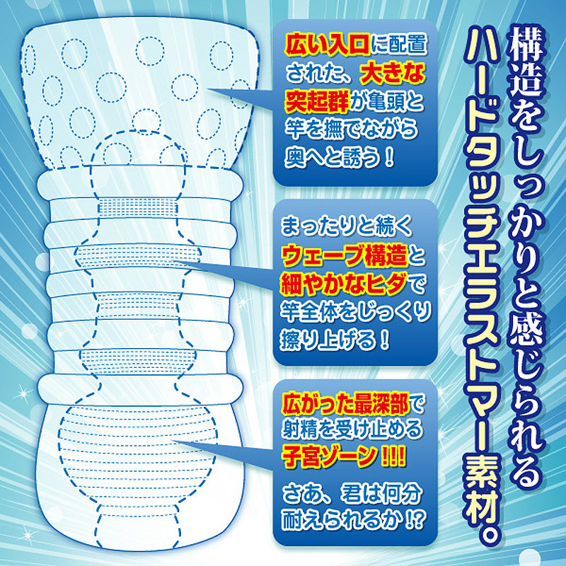 ●内部構造を活かすハードタッチエラストマー素材●耐久性に優れたむっちり肉厚のクリアボディ●挿入直後から優しく包み込む無数の突起●じっくりまったりとした締めつけが続くウェーブ構造●最奥は全てを受け止めてくれる広い子宮ゾーン●メンテナンスしやすい貫通タイプ●ミニボトルローション付属。