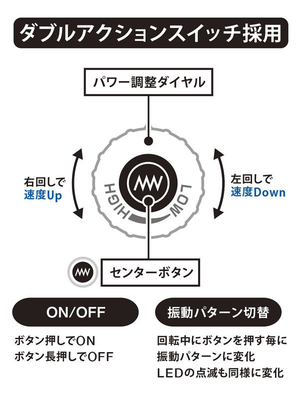 ●前作より細長いスリム形状●ヘッドは汎用性高めな45mm径を継承●速度調節はくるくる回すダイヤル式●右回しで速度UP・左回しで速度DOWN●中央のボタンで振動10種切り替え●ボタンを押すとON、長押しでOFF。