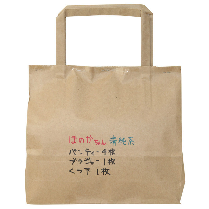 ●女子校生の脱ぎたて下着セット●紙袋にリアルな女性の名前付き●パンティ×4・ブラ×1・靴下×1●色や柄は開けるまでのお楽しみ。