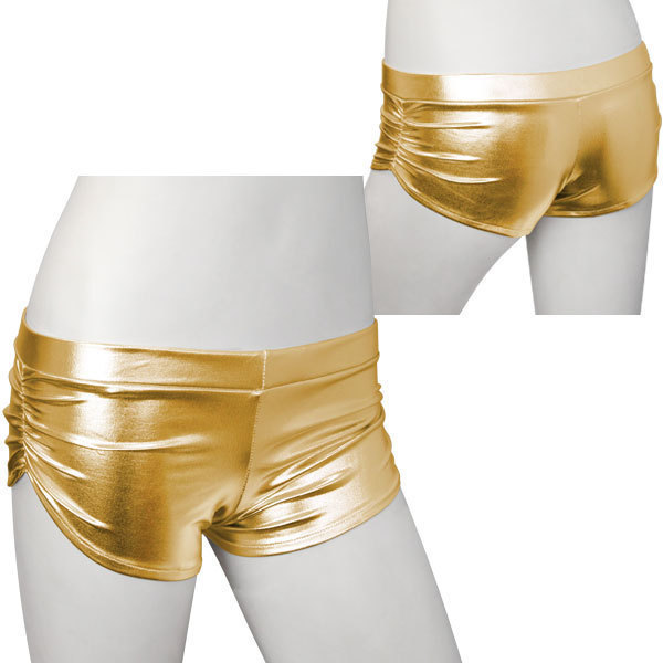 眩しすぎて直視できない?ギラッと輝くキラキラホットパンツ。●金属的な煌めきのゴールドカラー●フィット力抜群な伸縮素材を使用●インナーが見えづらいローライズ●両サイドにギャザー入り。体のラインが浮き彫りになるタイトな作りでセクシー度UP!ギャザーによる陰影でキラキラ加減がより一層引き立つステージ衣装風コスチュームです。