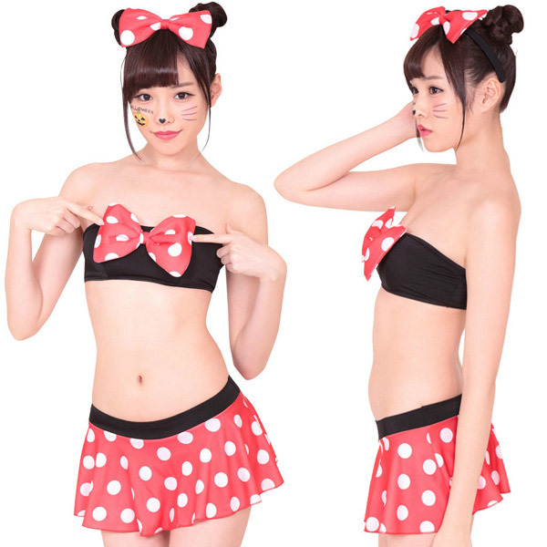 ●上下セパレートのビキニタイプ●赤・白・黒のビビッドな色使い●黒いチューブブラ×胸元リボン●ドット柄のスカート付きパンツ●お揃いリボンのカチューシャ付●実際に入水することも可能。
