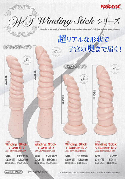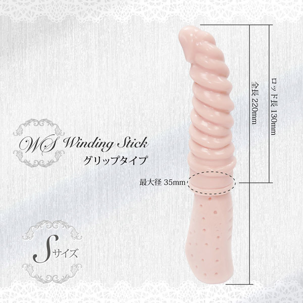 この「ワインディングスティック」は、ピストンも奥突きも思いのままに楽しめるといううねる立体螺旋フォルムのグリップ式ディルド!膣奥をホンモノ以上の挿入感で刺激し、むっちり弾力のエラストマー素材と刺激的な凸凹スパイラル形状でかつてないほどに充足感を与えてくれます。