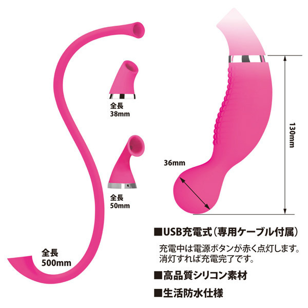 | ■ サイズ・ セット内容 | パッケージ:30.0×11.8×5.3cm 本体:挿入部13.0×3.6cm・アタッチメント小全長3.8cm・アタッチメント中全長5.0cm・アタッチメント大全長50.0cm セット内容:バイブ本体、吸引ホース×3種、充電ケーブル USB充電式 | ||