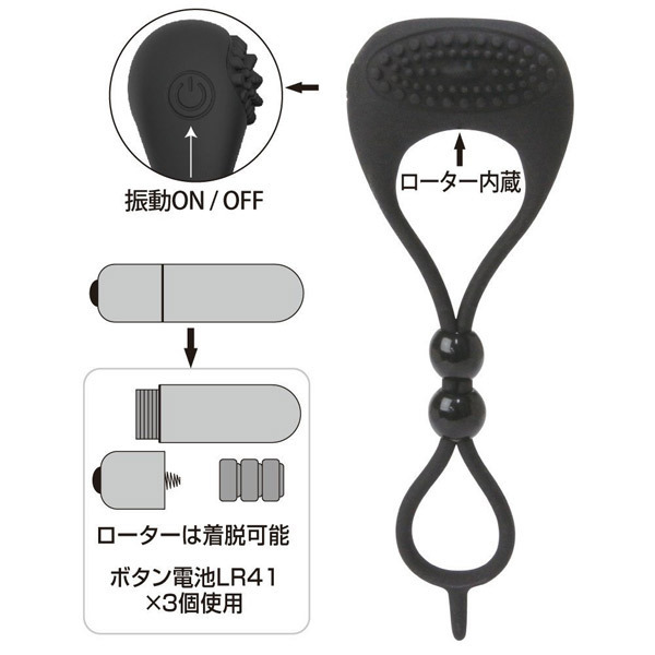 ●高品質シリコン素材のコックリング●2つのボールをスライドして調整●締め付けにより早漏防止をサポート●振動&ブラシでパートナーも刺激●ワンタッチ電源のシンプル振動搭載●ボタン電池LR41×3個付属●ローター部分は着脱可能。