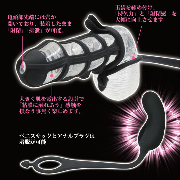持久力サポートと前立腺刺激で射精感を大幅UP!高品質シリコン素材を採用したペニスサックは、挿入感を損なわないメッシュ形状!また、亀頭先端部に穴が開いているので装着したまま射精&排泄が可能です。
