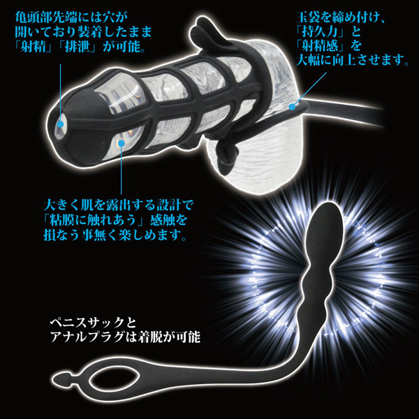 持久力サポートと前立腺刺激で射精感を大幅UP!高品質シリコン素材を採用したペニスサックは、挿入感を損なわないメッシュ形状!また、亀頭先端部に穴が開いているので装着したまま射精&排泄が可能です。