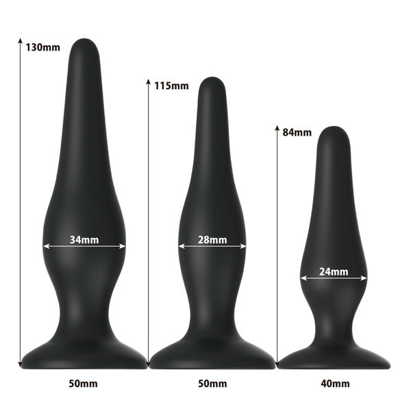 高品質シリコン素材のボディは大中小の3サイズすべてが無理なく挿入しやすい流線形状!底部には固定できる強力吸盤付き。