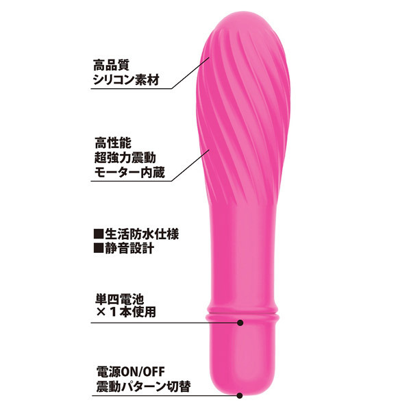 高品質シリコン素材のボディは程よい柔らかさで肌触りも抜群!キャンディのような美しいねじれカーブに、高性能な超強力振動モーターを内蔵、10パターンのバイブレーションを搭載しています。
