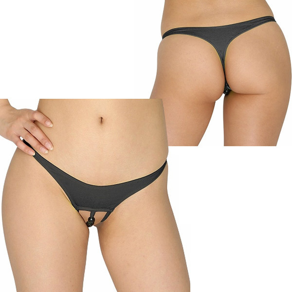 サラッとした質感で丈夫な水着生地を採用!大玉5連ビーズ付きのオープンパールショーツ。クールなブラックカラーのシンプルデザインながら、Tバックでヒップラインをセクシーに強調!さらにオープンクロッチのセンターに大玉のビーズを配置した刺激的なレディースランジェリーです。