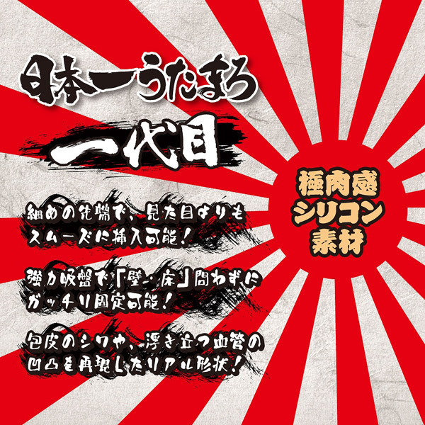 これぞまさに日本一!極肉感シリコン素材のリアルディルド「日本一うたまろ 一代目」。全長19cmの立派なロングサイズで奥まで届く『一代目』タイプは、細めの先端で見た目よりもスムーズに挿入可能!吸盤付きなので壁・床問わずにガッチリ固定できます。包皮のシワや浮き立つ血管の凹凸を再現したリアル形状のディルドです。