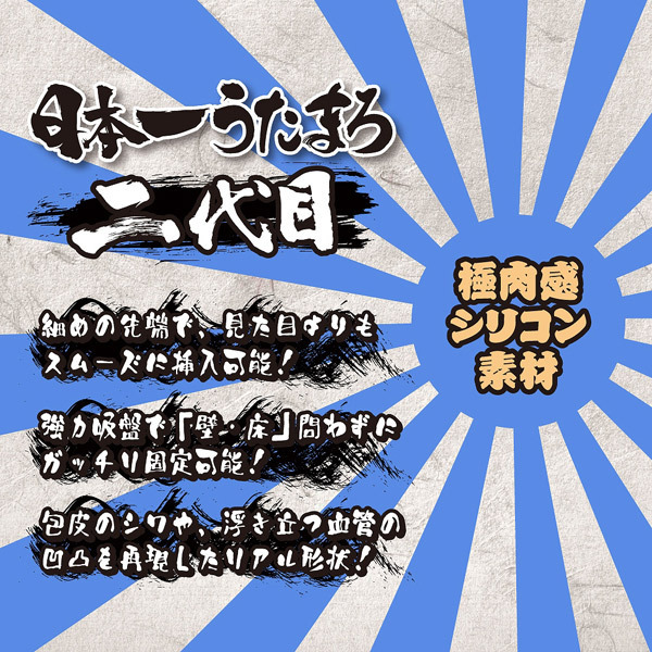 これぞまさに日本一!極肉感シリコン素材のリアルディルド「日本一うたまろ 二代目」。全長15cmの程よいサイズで挿入感抜群の『二代目』タイプは、細めの先端で見た目よりもスムーズに挿入可能!吸盤付きなので壁・床問わずにガッチリ固定できます。包皮のシワや浮き立つ血管の凹凸を再現したリアル形状のディルドです。