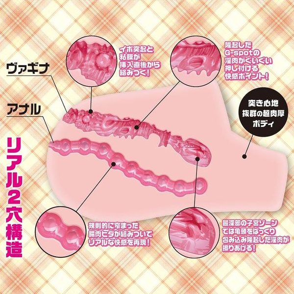 さらに進んだ最深部の子宮ゾーンでは、亀頭部分をくわえ込むようにフィットしながら淫らな内壁が精を絞るとるように擦りあげる!また、アナル側は本当に腸壁内にいるような締め付け感と、ヒダが絡み付いてくる快感を味わうことができ、終始規則的に窪んだ腸壁と刺激的な内壁で貴方をフィニッシュへと導きます♪どちらの穴も貴方を欲する発情状態のカノジョを上手く再現した商品となっています。
