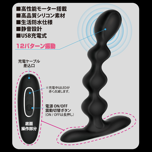 先端に内蔵された高性能モーターが、お尻の中で12種類のハイパワー振動!最大内径27mmのビーズでポコポコと刺激しながら根元まで入れれば底面が会陰を刺激、前立腺を貫く刺激と相まった強い快感に息も絶えだえに♪この強烈な振動は貴方の想像を絶する!!充電コード付属