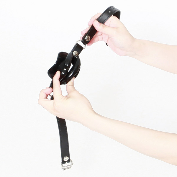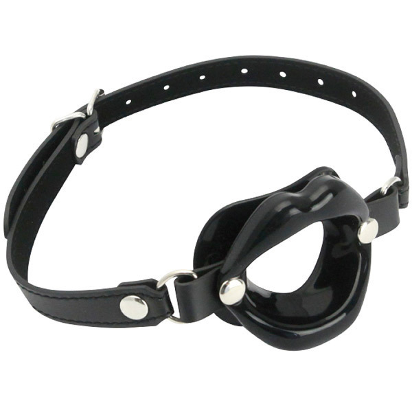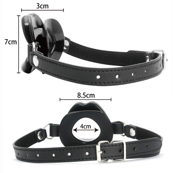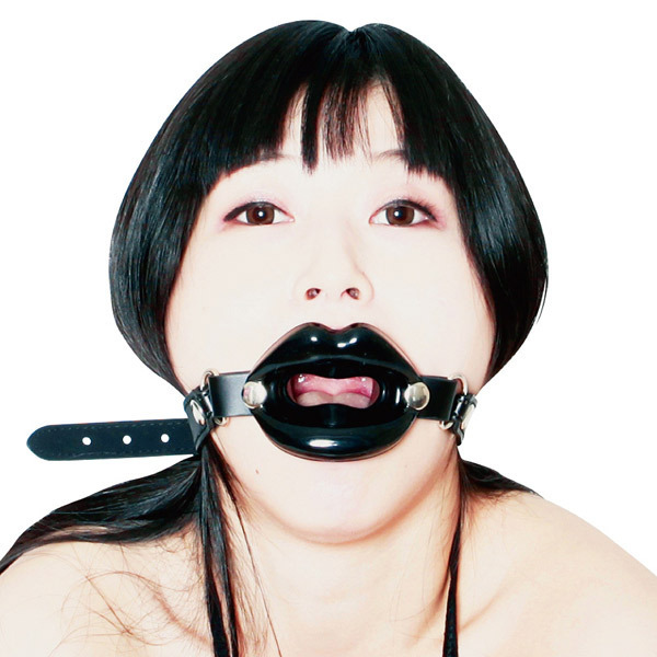 イラマチオ動画さながらの刺激的なプレイを楽しめる!合皮ベルトと高品質シリコンの黒い唇で口元を固定する口枷。