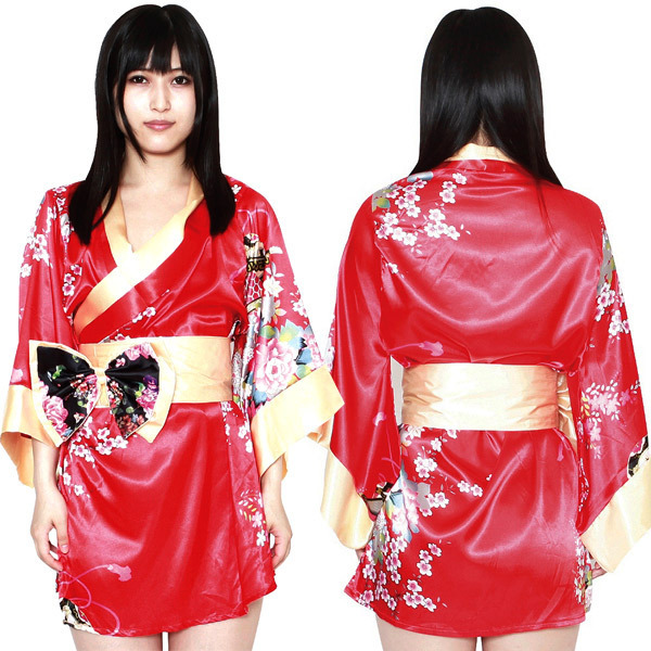 官能的な赤いミニ丈着物に金×黒の帯が映える美しい花魁風の着物コスプレ♪主張しすぎない程度にちりばめられた花模様が大人の色気の中に可憐さをプラスしています。