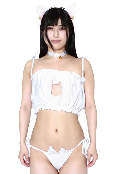 胸元を猫マークにくり抜いたふんわりシフォンのトップスと、いたるところに可愛らしいネコモチーフを取り入れた紐パンツ、そして鈴付きの猫耳カチューシャの3点セット!エロと可愛さを両立させたとってもキュートなキャットガールコスチュームです。
