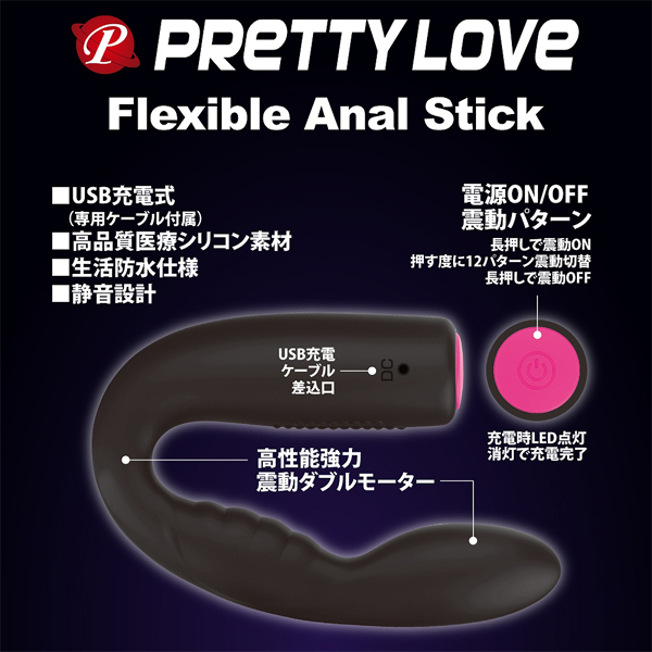 自在にグネグネと曲げられるスリムなボディのアナルバイブレーター。スムースな挿入で的確に前立腺を刺激します。●12パターン振動●高品質シリコン素材●生活防水●静音設計●専用USB充電コード付属、充電時間:60分、連続稼働時間:40分