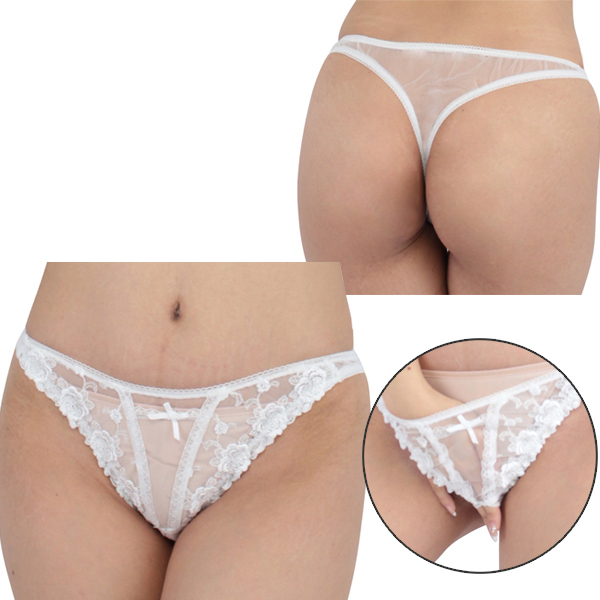 透け感のあるシースルー生地に、花の刺繍やスカラップレースなどあしらいエレガントに仕上げた可愛らしい日本製オープンランジェリー(ホワイト)。お尻の丸みが際立つTバックで、クロッチ部分は着衣プレイに最適なオープン仕様となっています♪