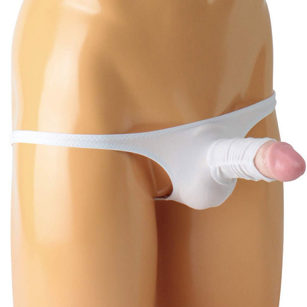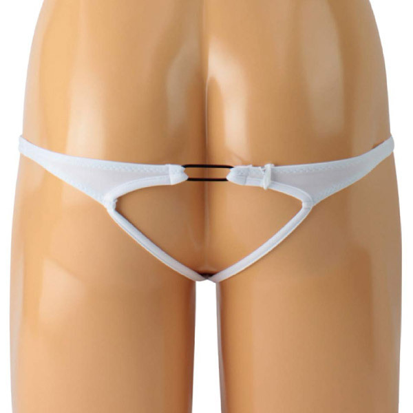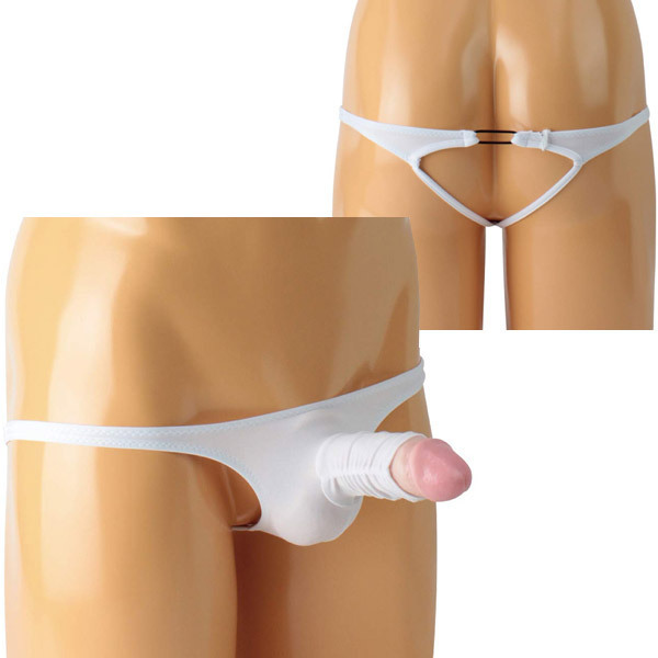 亀頭をチラリと覗かせるエロティックデザインの日本製Vバック(メンズ用)。上下左右に伸縮性のあるストレッチ生地を採用した穿き心地の良い男性用ショーツ!ホワイトカラー、Mサイズ