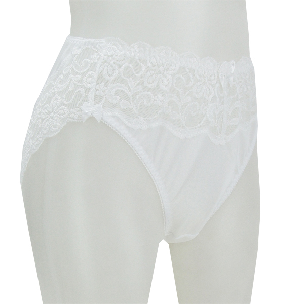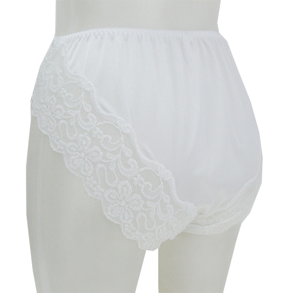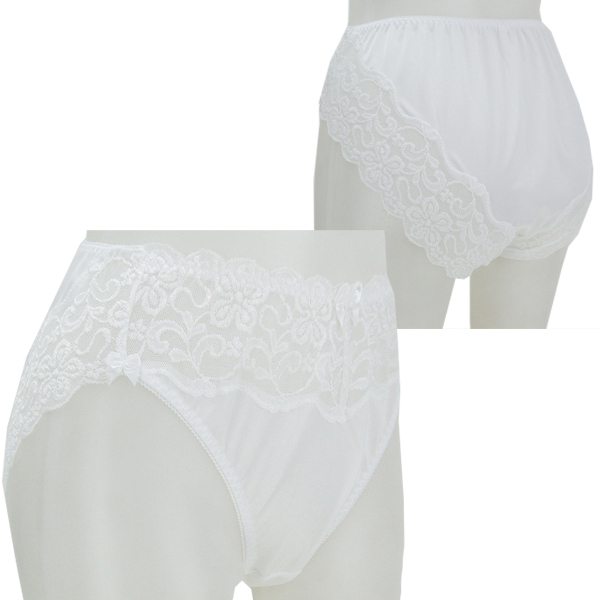 可憐な花柄レースと柔らかな光沢生地で華やかに演出する日本製フルバック(白)。清潔感のある純白生地と美しい幅広のレースで清楚にアピール♪