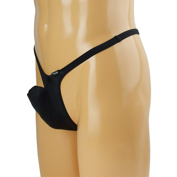 男のシンボルを逞しくセクシーに魅せる上向き縫製の日本製メンズ用Tバック(黒)。伸縮性のある2wayストレッチ生地使用で穿き心地抜群!サオや袋を包み込むようにしっかりと支えつつ、もっこり具合で男らしさをアピール♪