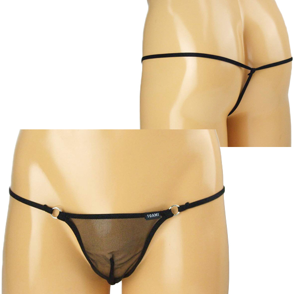スケスケ素材で大胆に魅せる丸型サイドリング付の日本製のメンズ用Tバック(黒)。通気性の良い極薄生地が男性のシンボルを引き立てる!セクシーさをアピールしたい時だけでなく、蒸れやすい暑い時期にも快適に使用できる一枚です。