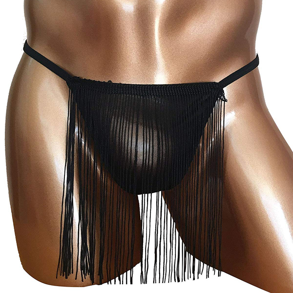 昔懐かしいふんどしが現代風に蘇る!フリンジ付のメンズ用Tバック(黒)。日本古来の男性下着をオシャレでセクシーにデザインした男のためのふんどしパンツ!後ろはお尻を強調するTバック仕様。洗濯の際は網ネットに入れるか、優しく手洗いで洗濯してください。