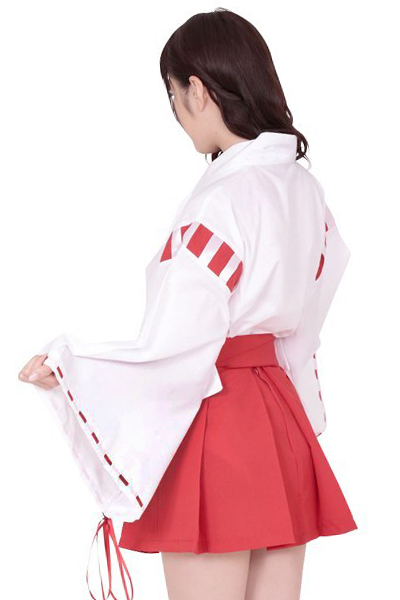 大人気の巫女さんコスプレに大きめサイズが登場!白の着物に赤のパイピングがアクセントになった巫女コスプレ。袴風のミニ丈スカートが可愛い!コスプレイベントほか、忘年会や年末年始の衣装に◎