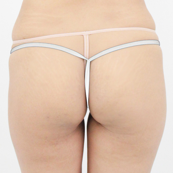 ゴールドリングで伸縮性のある2wayストレッチ素材の紐をジョイント!極限まで露出した大胆過激な日本製のレディース用Gストリング(白)。
