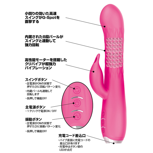 8段×6連で設置されたパールがスイングと連動して強力回転!さらに追い打ちをかけるように高性能モーターを搭載した子機で敏感ポイントを徹底刺激する♪生活防水加工を施した高品質シリコンボディ仕様◎個別での動作操作も可能