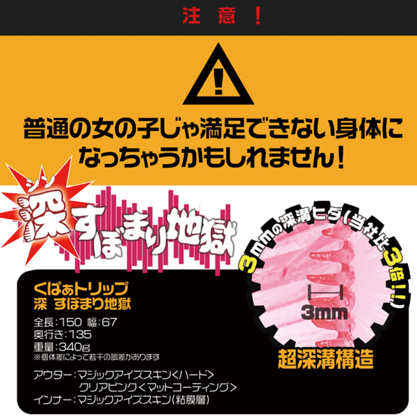 実用性に特化した「くぱぁトリップ」シリーズの新作!奥へ進むほど狭まる3mm深溝ヒダ構造の高刺激な非貫通オナホ。片手で扱いやすい340gのハンディタイプ!外は硬め、中はねっとり絡みつく粘膜質な内部設計。中が見てわかるクリアボディで素材にはマジックアイズスキンを採用しています◎ローション付属、ケース付