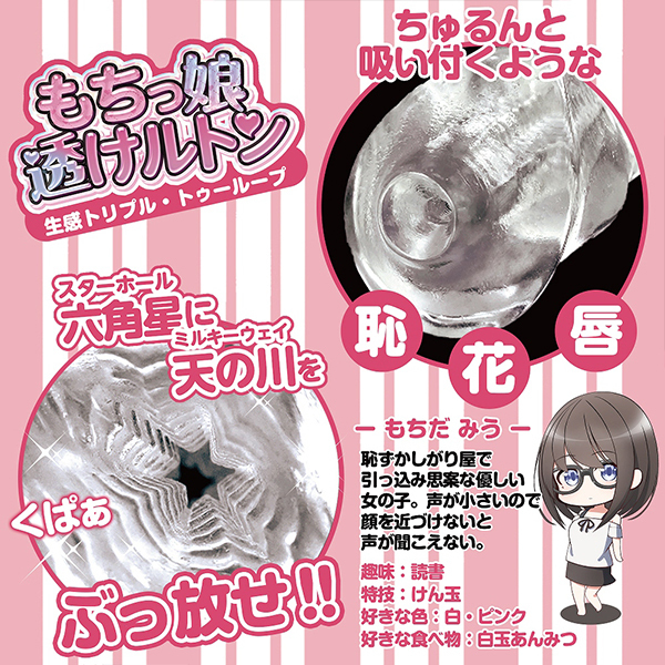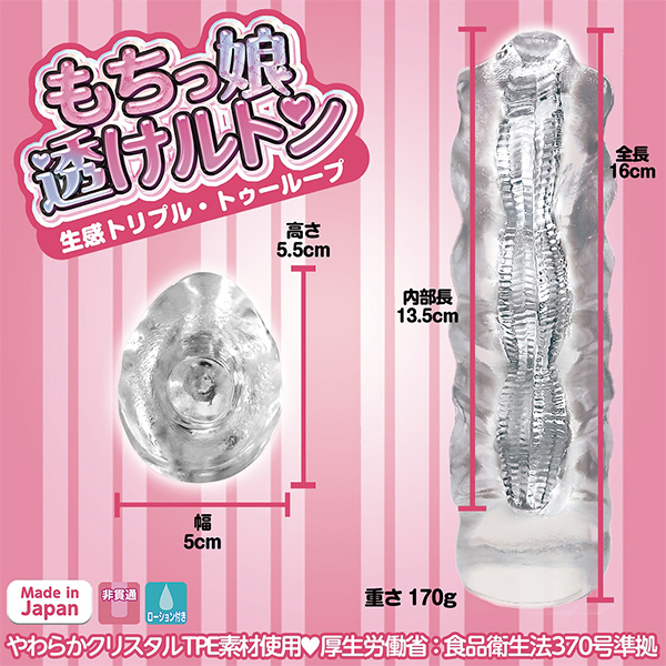 これはまさに透明なオナホ!?クリアな素材なのに柔らかくてモチモチの硬度に設定された非貫通オナホ「もちっ娘透けルトン」の生感トリプル生感トリプル。