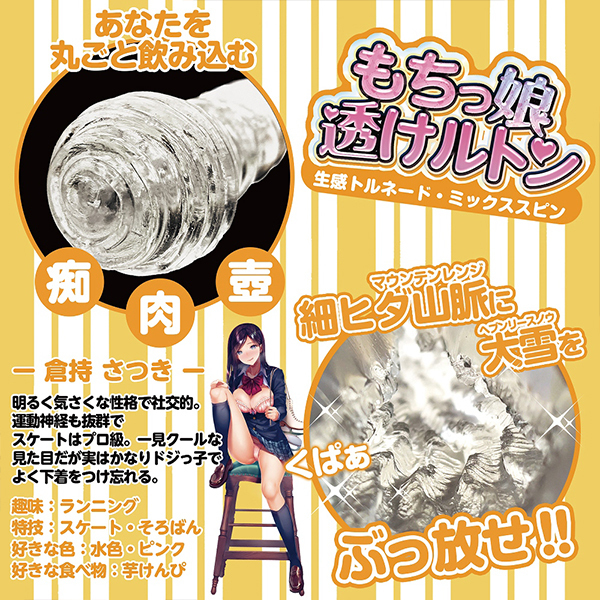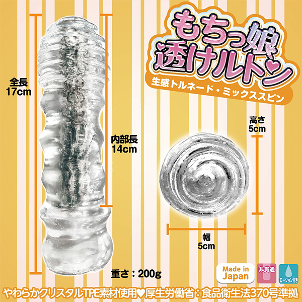 硬めでハード系なイメージを持つクリア素材の常識を覆す!素材はクリアでも固くない日本製の「やわらかクリスタルTPE」を採用した非貫通タイプのスケルトンオナホ「もちっ娘透けルトン」の生感トルネードミックススピンです。