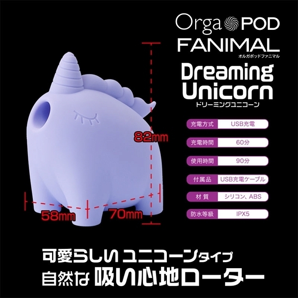 可愛らしいデザインですが吸引力はパワフル。力強さと優しさを兼ね備えた吸引をお楽しみいただけます。全10パターンの吸引パワー・吸引パターンをお楽しみください。素材は肌に優しいシリコン製、つるっとした柔らかい感触をお楽しみいただけます。また60分の充電でおよそ90分の連続使用が可能です。●カラー:ドリーミングユニコーン