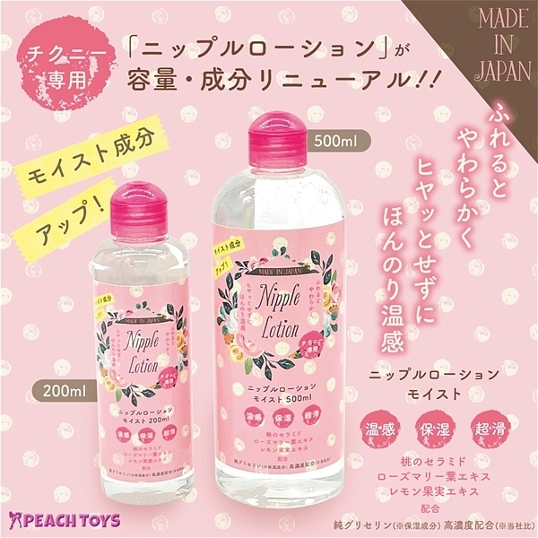 「チクニー専用 ニップルローション(180ml)」が、容量と成分をリニューアルして新発売!!200mlに容量アップでたっぷり使えます。追加成分!「ニップルローション モイスト」は、レモン果実エキス・ローズマリー葉エキスを追加配合!チクニー専用ニップルローションは、ふれるとやわらかくヒヤッとせずにほんのり温感タイプでとても使いやすい商品です。