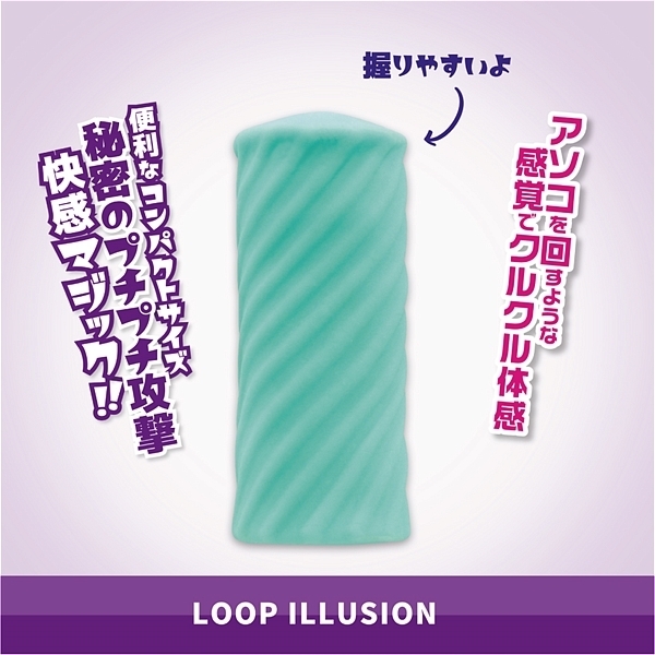 回技の魔法でフラフラに!コンパクトサイズの本体に大小のプチプチの刺激と横ヒダの引っ掛かりで搾り取る360度全方向刺激型、表面のスパイラルな溝は握りやすいだけでなく裏返して使用できるリバーシブルな簡易グッズ。ローションも付属しているので旅行先などでも使用可能。