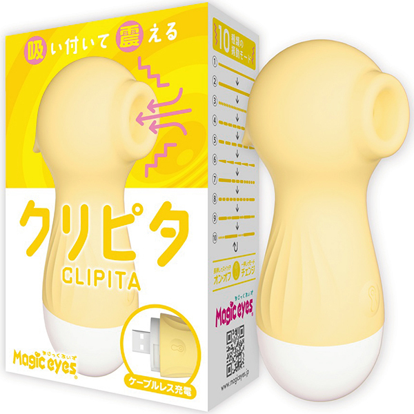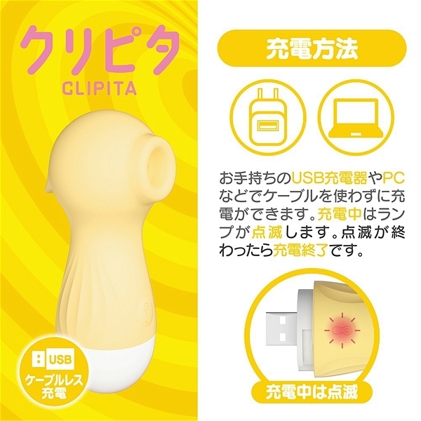 大人気のクリピタに新色イエロー登場。吸い付いて震えるクリピタは、シリコン素材で柔らかい触感とケーブルレスで簡単充電が特徴の吸引グッズ。持ち運びにも便利な専用ポーチで保管してください。充電時はUSB端子に直挿しが出来るためコードの必要がありません。吸引部は丸洗い可能なので清潔にご使用頂けます。