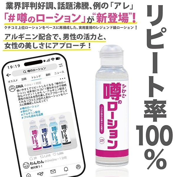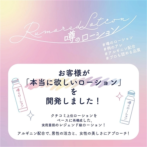これが業界評判「噂のローション」!プロが認める確かな品質、驚異のなめらかさ、そして圧倒的な持続性!L−アルギニン配合で、男性の活力と、女性の美しさにアプローチ!クチコミ上位ローションをベースに再構成した、実用重視のレジェンド級ローション。