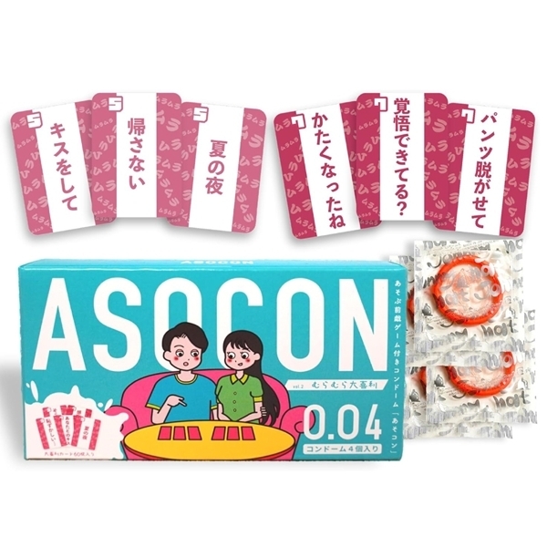 笑って盛り上がる新感覚のゲーム付きコンドームセット♪あそぶ前戯ゲーム付きコンドーム「ASOCON」むらむら大喜利は、ユニークなカードゲームでパートナーとの時間を楽しく演出します!付属のカードを使って五・七・五の川柳を作り、お互いのセンスを競い合いましょう♪クスッと笑えるフレーズやちょっと照れる内容で、自然と会話も弾みます!カードは全部で60枚!毎回異なる展開になるので、何度でも楽しめるのが魅力です♪説明カードも付属しているので、すぐにルールを理解して遊べます!コンドームは0.04mmの使いやすい厚さで、4個入り♪素材は天然ゴムラテックス製、ゼリー加工でスムーズな使用感を実現!見た目はシンプルでも、中身は工夫たっぷりのユニークなセットです♪特別な夜に、ちょっとした遊び心をプラスしたい方におすすめです!