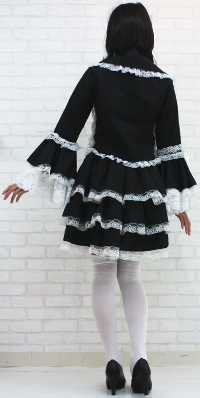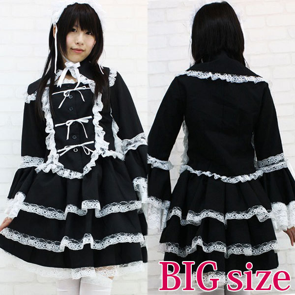 | ■ サイズ・ セット内容 | BIGサイズ:B85〜90cm・W90〜116cm 丈:上着53cm(袖65cm・肩幅39cm)・スカート48cm セット内容:ジャケット(前ボタン留め、姫袖)・別衿・ヘッドドレス(総レース仕様、バラのコサージュ付き)・スカート(ウェストゴム入り) | ||