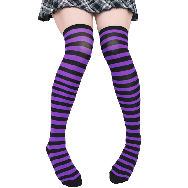 コスチュームのアクセントに!パープル×ブラックのボーダー柄ニーハイ。1cm幅の細めボーダーがとってもキュート!コスプレ衣装はもちろん、私服にもコーディネート出来ちゃう優れもの!ヘビロテ確実のしましま柄ニーハイソックスです。